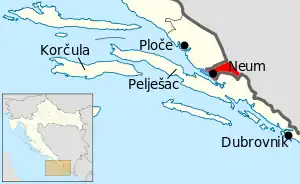 Neum is a resort town on the 9 km strip of Adriatic coast that belongs to Bosnia and Herzegovina. In other contexts this country is often loosely referred to as "Bosnia", but Neum is specifically part of Herzegovina. That entity is undefined and contentious so on this page the country is abbreviated to BiH. In 2013 the Neum strip had a population of 4653, most of them in the town itself.
