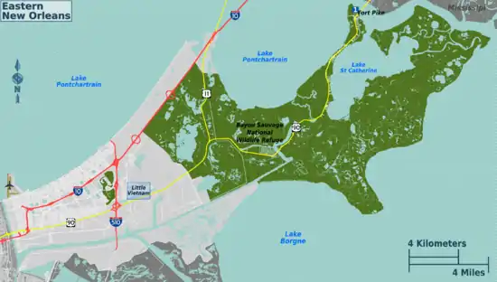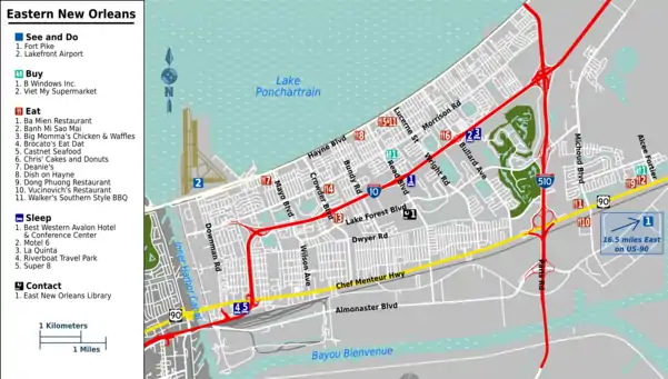 It is pointless to try and get around this area without a car. The principal highway is of course I-10, which most travelers use to rocket through the area without visiting, but US-90 (Chef Menteur Hwy) cuts through or just south of the populated areas, and is the route to take to Little Vietnam or eventually all the way to Fort Pike. Bear in mind that this area is huge—about the size of the entire rest of the city. Plan to be driving for quite a while if going to Fort Pike, closer to the Mississippi State border than it is to the French Quarter. East of Little Vietnam, the district is nearly empty, so don't go out on US-90 with an empty tank.