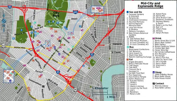 Mid-City's central location allows easy access to other parts of town. Take the Canal Streetcar to the French Quarter and the Central Business District. Drive or take the bus to the other end of beautiful Esplanade Avenue to arrive at the lower edge of the Quarter and the hip Faubourg Marigny neighborhood (alternatively reached by taking the Canal Streetcar to the far end at Esplanade and the river levee). Lakeview and Lakeshore neighborhoods are a short drive away to the north west; to the north east is the Gentilly neighborhood. The Carrollton neighborhood at the upper end of Uptown can be driven to by taking Carrollton Avenue to the other end. The #32 bus "Leonidas" runs from Carrollton Avenue at Esplanade Mid-City to the Old Carrollton Riverbend neighborhood then ends by the Zoo in Audubon Park. However it winds through a rather rough section of Hollygrove en route, and it runs less than once an hour. Those relying on public transit may wish to consider getting to Uptown and Carrollton by a more indirect route: take the Canal Streetcar to the Central Business District, then the green St. Charles Streetcar up. While this route is longer, it may be less aggravating and is certainly much more picturesque.