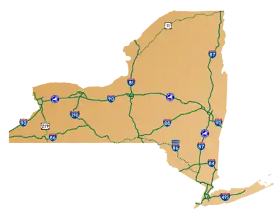 - From Pennsylvania and New Jersey: U.S. 219 heads north near Olean, headed for Buffalo. U.S. 15 connects with I-86 in Corning; you can continue north on NY 15 or I-390 to Rochester. I-81 connects with NY17 in Binghamton, headed for Syracuse. I-84 passes through the lower part of the state. I-95 is the major east coast route and passes through New York City.