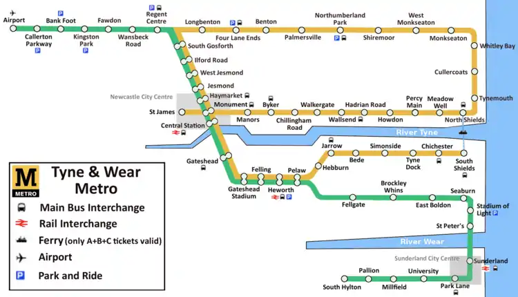 Tyne & Wear Metro is quick and inexpensive, and is the best option for outlying areas. There are two lines, mostly overground, but running together underground through the city centre. The Green Line runs from the airport to South Gosforth, city centre, Gateshead, Heworth, Sunderland and South Hylton. The Yellow Line makes a great loop north from St James in the city centre to Wallsend, North Shields, Tynemouth, Whitley Bay then South Gosforth, back through city centre (crossing itself at Monument) then Gateshead, Heworth, Jarrow and North Shields. So for the north bank of Tyne always take the anti-clockwise loop, but for Whitley Bay you could go either way.