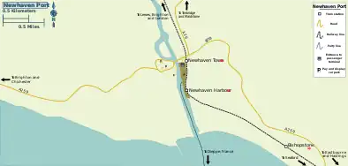The port was built in the mid-19th century and has a passenger terminal, with a small cafe, the Haven Cafe, ☏ +44 1235 844 117. There is also a car park at the terminal, which costs £4.50 per 24 hour period (however, this can only be paid for at the terminal and can't be pre-booked). More car parks are available in the town, most on the other side of the river though (see below). There isn't anything else really at the terminal, so long waits there won't be fun. If you want to buy anything like a newspaper or magazine, the Sainsbury's just along the A259 to the east about 10 minutes walk away will be the best option.