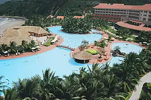 - 🌍 Diamond Bay Resort & Spa Nha Trang, Diamond Bay, Song Lo, ☏ +84 58 711711. This extremely spaciously laid-out resort hosted the 2008 Miss Universe pageant. Hotel rooms, suites and villas. Enormous pool (non-chlorinated) spa, fitness, several restaurants & bars, tennis, expatriate chef and expatriate GM. Two private beaches. US$125-600.