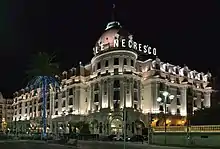 - 🌍 Negresco, Promenade des Anglais 37, ☏ +33 4 93 16 64 00. Famous landmark hotel. Houses Le Chantecler, a bar and a brasserie. Worth a look even if you are not staying there. Can be very expensive depending on season. €500-2000.