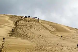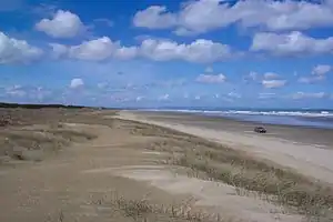 Ninety Mile Beach is a long beach (actually 58 miles or 93 km long) in the Far Far North of New Zealand. Legally a road, it is used for sightseeing trips to Cape Reinga, and the high dunes at Te Paki are used for sandboarding.