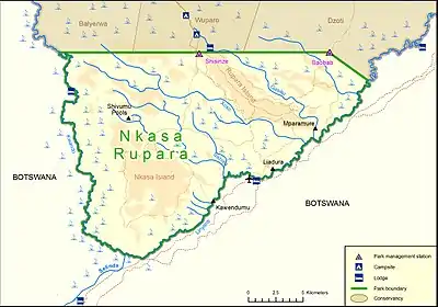 The park is about an hour south of Mudumu. To access Nkasa Rupara National Park turn off the B8 Trans-Caprivi Highway, onto the D3511 after the Kongola Bridge. The only entrance track crosses a bridge over a back-channel of the Kwando/Linyanti River, near Sangwali village in Wuparo Conservancy.[4] Rupara Island is reached via a dirt track; Nkasa Island in not reachable because the access is flooded.