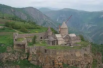 • Tatev Monastery - Notable even in a country known for stunning landscapes and architecture. The massive monastery complex is a continuation of a sheer cliff that drops below it for hundreds of meters. Once the seat of great wealth, this monastery controlled much of the surrounding countryside. It saw invasions, peasant rebellions and earthquakes. A severe earthquake in the 20th century caused great damage that was partially fixed during Soviet times. Now, it's still a spectacular site accessible by a long, bad road, which deters many visitors. At the foot of the cliffs you'll find Satan's Bridge (see below)