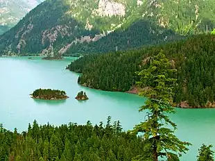 - 🌍 Gorge Lake Campground (just outside the town of Diablo, north of SR 20 at mile post 126. Twenty miles (32 km) east of Marblemount, 67 miles (108 km) west of Winthrop.). 8 sites. All sites are first-come, first-served. On the bank of Gorge Lake, next to the cascading Stetattle Creek. Elevation 900'. Check out time noon. Primitive camp with no water. Vault toilets. Recycling and trash collection. Recreational Opportunities: Boat launch on Gorge Lake. Fishing on Gorge Lake. Hiking trails nearby. $10 per site (2020 rates).