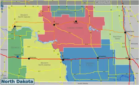 | Western North Dakota Adams, Burke, Divide, Dunn, Grant, Hettinger, Mercer, Morton, Mountrail, Oliver, Sioux, Stark, Williams counties. |