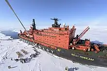 There are two commercial sea vessels making regular trips to the North Pole, the nuclear-powered Russian ice-breaker Yamal, and 50 Years of Victory, operated by the Murmansk Shipping Company. They depart from Murmansk (tour packages beginning in Helsinki and in Moscow), making several two-week journeys in the Summer (when the ice is easier to get through). Yamal is equipped with 50 cabins and suites with private bathrooms and exterior windows, fine dining, heated indoor pool, gym, library, etc. 50 Years of Victory, the largest icebreaker ever built, has 64 cabins in five categories. Voyages are booked by a variety of tour operators (including some of the air-excursion outfits, plus several others), generally at about US$18,000–25,000 per person (double occupancy).