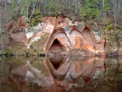 - Salaca River — With mostly fast stream, multiple sandstone cliffs and caves, suitable for several days long boat trips. A popular destination of local tourism is Mazsalaca. For water tourists Salaca River is always an adventure - peaceful and scenic sections interchanging with impressive canyons including the locally famous echo cliff Skaņaiskalns. Museum in Valtenberģu manor with expositions as Genealogy tree room, 31 Walter Hirt tree sculpture collection hunting trophies, play mouse collection. The longest natural caves of Latvia, the 300-m-long Dauģēni or X caves are located at Salaca.