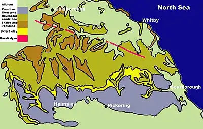 The main deposition of sandstone was early Jurassic, beneath a shallow tropical sea. Also deposited were shale, clay, limestone, ironstone and rocks bearing alum - the iron and alum were mined in modern times. The area then uplifted and became a coastal plain covered in river mud alternating with calcareous sea deposits. Near the end of the Jurassic it submerged again, for a time being shallow enough for corals.