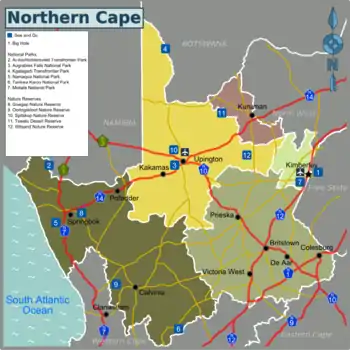 | Green Kalahari Famous for Augrabies Falls, an awe-inspiring waterfall, and for the Kgalagadi Transfrontier Park, a desert landscape with migrating herds of animals and unending red dunes |