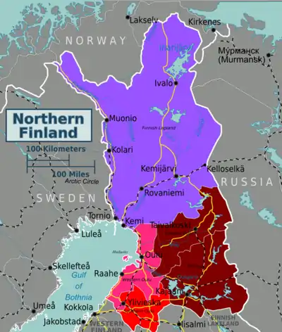 Northern Finland is the northernmost part of Finland. Administratively it comprises Finnish Lapland and the provinces of Kainuu and Northern Ostrobothnia. This region is very sparsely populated even for Finland – while it covers almost half of the country it has a population slightly larger than the city of Helsinki.