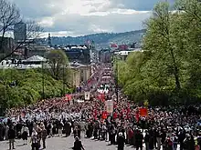 17 May, the constitution day, can perhaps be a bit overwhelming for foreigners, as the country is covered in flags, citizens dress up in their finest clothes and celebrate all day long. Norwegian nationalism is however generally an expression of appreciation of living in a successful community and stable democracy, not aggressive in any way. On constitution day, dress up and try to say gratulerer med dagen (literally "congratulations on the day") to anyone you meet, and you will probably get the same in response and see a lot of smiles, even if you're not Norwegian at all. Norwegians take pride in the fact that the parades on constitution day are made up of school children and families instead of military troops. 17 May is a celebration of the 1814 constitution that established Norway as a liberal democracy; the constitution is still in effect, as one of the oldest written democratic constitutions (surpassed by that of the USA). Norway shared a monarch with Sweden until 1905 while Norway was ruled according to the 1814 constitution.