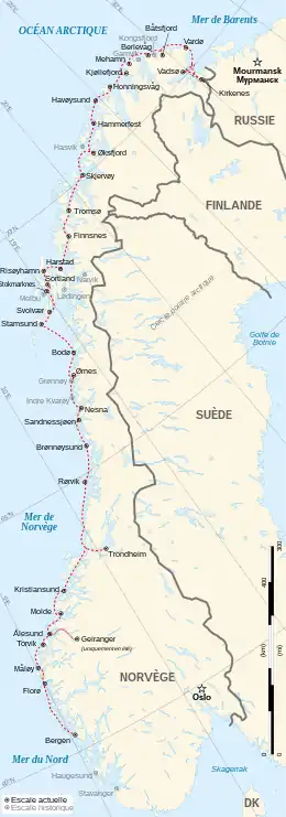 Norway (Norwegian: Norge or Noreg) is the westernmost, northernmost — and surprisingly also the easternmost — of the three Scandinavian countries. Among the Nordic countries only Finland stretches slightly further east. Norway is known for the complex and deep fjords along its west coast, as well as the midnight sun and Northern Lights.