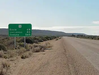 For much of its length, the Eyre Highway can be described as a long and lonely road. While in the East in South Australia you still find some small towns like Kimba, Wudinna and Ceduna with some fencing suggesting farmland the Western Australian side of the trip has little or no visible agriculture adjacent to the highway. What you will find are roadhouses, sometimes a mixture of a hotel, a caravan park and garage. Border Village, right at the border between South and Western Australia, and Eucla seem different but most of the stopping places are just plain dusty, with little to offer and of low interest. The mean distance between them is about 100 km, with the longest stretch being 190 km. (between Balladonia Roadhouse and Norseman). The stretch of road between Caiguna Roadhouse and Balladonia Roadhouse is known as the 90-mile straight. It's the longest stretch of straight road in Australia, 146.6 km of asphalt without a single curve! Towns east of Caiguna do not follow official Western Australian time. Instead, they use what is unofficially known as Central Western Standard Time, which is halfway between Western and Central time--UTC+8:45.