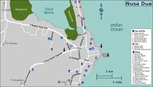 This article covers everything in the Nusa Dua enclave plus the Tanjung Benoa peninsula and a few points west of the enclave to the village of Sawangan. Everything on the Bukit Peninsula to the west of Sawangan is covered by the Uluwatu article.