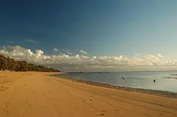 - π Pantai Geger (Geger Beach). This is the public beach in Nusa Dua. This splendid white sand beach at the western edge of the enclave retains lots of the character that is missing in the sanitised Nusa Dua resort zone. Generally safe for swimming and some beach side warungs. The restaurant, beachbeds and massage ladys all work for the local cooperative. By supporting them you support the locals. Geger has a cooling breeze as it is one of the few beaches facing east and because of the reef far out from the beach it has some of the warmest water temperatures in Bali. Head westwards out of the Nusa Dua enclave passing the golf course and then the St Regis Hotel (on your left). Shortly after the St Regis, take the first turning left towards to the beach and proceed to the Pantai Geger car park.