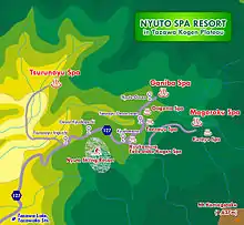- Ohkama (大釜). An old school building had been relocated to the current location and now serving as a spa lodge. Only Ashiyu (Footbath) in Nyuto is open to public during summer.