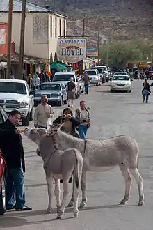A group of wild burros visits daily to munch on carrots that local shopkeepers are all too happy to sell. They have become obese from the practice and the U.S. Bureau of Land Management has requested shop managers stop selling carrots. Some are selling alfalfa cubes to offer the burros instead. Feeding baby burros is discouraged, and some may sport a "Do Not Feed" sticker on their foreheads, provided by the BLM. Feeding wild burros on the road outside the town of Oatman is not legal and causes a road hazard. Pull well off to the side of the road to watch them.