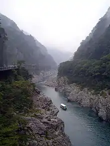 - Oboke and Koboke Gorge. The gorge formed by the Yoshino River is quite spectacular. The steepest and most rugged sections lie in the area between JR Koboke Station to the north and Tosa-Iwawhara Station to the south (with JR Oboke Station in the middle). Aside from rafting, pleasure boat tours are operated out of the Hotel Mannaka, offering views from withing the gorge but without the need to get wet. The gorges can also be viewed by either walking or driving along Rt 32. A fairly decent sidewalk is set up along the road between the Oboke Michi-no-Eki (10 minute walk north of JR Oboke Station) and the WestWest rest area, through which the sheer rock cliffs blast up from the river. This walk takes about 30-40 minutes one way. The JR train line follows this route too (on the opposite side of the river). The train's views are occasionally obstructed by small tunnels, but it doesn't necessarily reduce the impressive sights too badly.