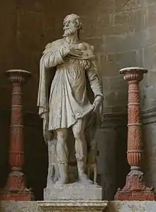 Statue of Saint Roch in Auch cathedral. The shells on his clothes clearly mark him as being dressed ready for pilgrimage to Santiago de Compostela