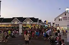 Ocean City is a beach resort town located on a barrier island along the Atlantic Ocean, on the east coast of the Delmarva Peninsula. The city is located in Maryland, with the adjacent beach town of Fenwick Island just over the border in Delaware. The city is about 10 miles long, running from the Ocean City Inlet to the south to the Delaware border to the north, and a few blocks wide. The downtown area is in the southern part of the city and contains the boardwalk, amusements, arcades, restaurants, shops, and older homes and motels. The central and northern parts of the are situated along a strip on Coastal Highway and are home to hotels, high-rise condos, restaurants, bars, shops, the convention center, and newer housing developments. The city has a year-round population of 6,800 (2020), but attracts between 320,000 and 345,000 vacationers on summer weekends and sees about 8 million visitors annually. Many visitors to Ocean City come from other parts of Maryland and the Baltimore-Washington Metropolitan Area, with other visitors coming from Virginia, Delaware, New Jersey, and Pennsylvania. The peak time for tourists to come to Ocean City is between Memorial Day weekend in late May and Labor Day weekend in early September. In June, the city is a popular destination for Senior Week, where recently-graduated high school seniors come to Ocean City to spend a week with their friends.