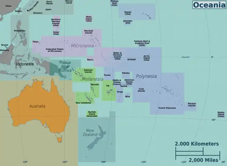 Australia, New Zealand, and Papua New Guinea are by far the largest countries in this pseudo-continent, and the former two are the most visited by travellers. Oceania includes the vast island nation groupings of Polynesia (extending from New Zealand to the north and east), Melanesia (to the west, and south of the Equator), and Micronesia (almost wholly north of the Equator).