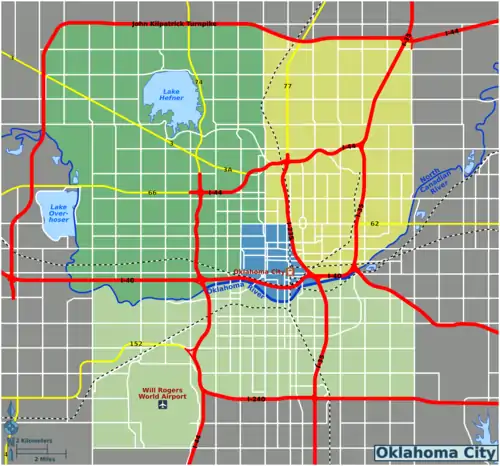 If you happen to have or rent a car, then getting around OKC is very simple. The streets are laid out in a grid, with named streets running north and south and numbered streets running east and west. The main thing to remember when driving the city is that when you're on the north side, the numbered streets increase from south to north, while on the south side they increase from north to south. (NW 23rd street is a very different place from SW 23rd street, and you don't want to get them confused.) Aside from that minor issue, navigation is a breeze: there are very few one-way street mazes or "Texas Turnarounds" to worry about, and the interstates in town are usually not congested, except during rush hour and construction.
