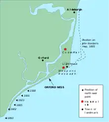 Orford is a small coastal town within the Suffolk Coast and Heaths AONB (Area of Outstanding Natural Beauty). The town is separated from the sea by a 10-mile-long shingle spit known as Orford Ness, the town being mid-way along the spit. The spit is connected to the mainland ay Aldeburgh and the River Alde flows along the coastline between the mainland and the shingle spit. The town is the only means of access to the Orford Ness nature reserve.