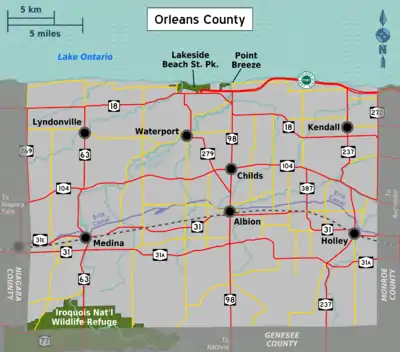 Fortunately for drivers, the county is criss-crossed by an array of well-maintained state routes. Routes 18, 104, 31, and 31A travel eastβwest, while routes 63, 98, and 237 are the main northβsouth routes. 104 is the primary highway, with only a few speed zones to slow you down, while 18 is a scenic lakeside route. 31 parallels the canal through Medina, Albion, and Holley, while 31A bypasses those villages to the south.