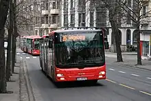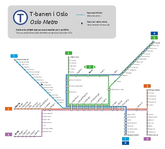 There is a comprehensive public transport system in Oslo, consisting of buses, trams, local trains, metro (T-bane) and boats. The public transport is planned and coordinated by Ruter. The five metro lines have numbers 1 through 5, the six tram lines have numbers 11 through 19, buses have labels from 20, while boats (ferries) are B1, B2 and so forth. Local trains operated by Vy are covered by Ruter ticket system. The local public transport of Oslo also covers the suburbs in Akershus, notably Bærum in the west, where the tram and metro cross the county line.