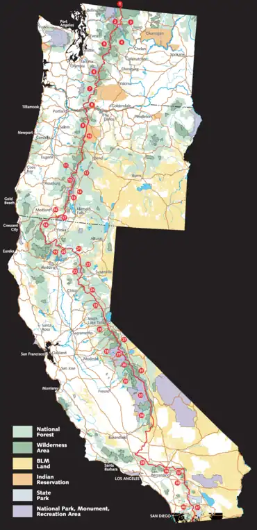 The following notable locations are found along or adjacent to the route of the Pacific Crest Trail. They are listed from south to north to correspond with the itinerary typically followed by thru-hikers to take advantage of the best seasonal weather conditions. The numbers in parentheses correspond to the numbers on the PCT overview map.