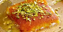 Palestinian cuisine is generally similar to that of neighbouring Jordan. Like in Jordan, mansaf is a popular dish of rice with meat, usually lamb. Kanafeh is a popular dessert made of cheese, soaked in a sweet sugar-based syrup and topped with shredded filo pastry. Nablus is famous for their variety of knafeh Nabulsiyeh.