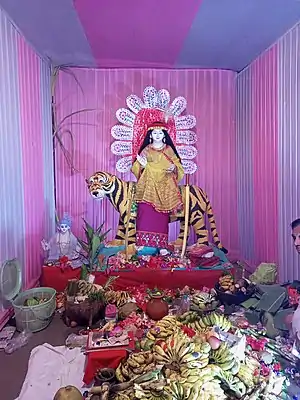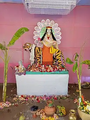 In the 17th century, goddess Panthoibi was worshipped as a war goddess riding on a tiger. The Cheitharol Kumbaba text recorded for the first time about the construction of a temple in honor of goddess Panthoibi in 1686. The same text also recorded for the first time about the crafting of her statue in 1699.