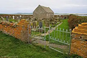 - π St Boniface Church. This dates from the 12th century, built over a 9th-century Pictish settlement and church eroding into the sea. Winfrid Boniface (675-754) was born in Devon but became a leading figure in the early German church, and archbishop of Mainz. He was organising missionary work to the Picts at the time of his murder by robbers, so this is probably why an Orcadian church was dedicated to him. The building was restored in 1993 and remains in use as a church.