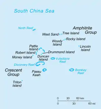 This tropical archipelago, about one-third of the way from central Vietnam to the northern Philippines, is composed of 130 small coral islands and reefs divided into the northeast Amphitrite Group and the western Crescent Group. It is surrounded by productive fishing grounds and by potential oil and gas reserves.