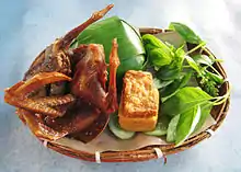 A typical Sundanese dish is nasi timbel, with steamed rice wrapped in a banana leaf, served with fried or grilled chicken, duck, or pigeon, tofu and tempeh, fresh vegetables, and sambal (chilli sauce). The city of Bandung is also known for soto Bandung (clear beef soup with soybeans) and siomay Bandung (also known as baso tahu, steamed dumplings served with spicy peanut sauce).