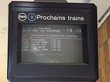Via rail the airport can be reached by a southern branch of the RER-B line that heads from Paris in the direction of Massy-Palaiseau or Saint-Rémy-les-Chevreuse (not Robinson). At Antony station RER-B line connects with the Orlyval light rail that carries passengers to both terminals of the airport. Orlyval runs every 4-7 min and costs €12.05 (as of 2019) for transfer to Paris, including connections to central area metro stations. The RER B from Antony runs through Paris to CDG. Public transport passes are not accepted on Orlyval (but Paris Visite is valid on Orlyval, and zone 1–3 passes are valid between Antony and Paris).