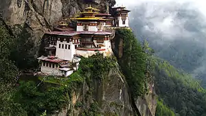 - 🌍 Taktsang Monastery (Tiger's Nest). Closed on Tuesdays. Precariously perched on the edge of a 1,200-m cliff, this monastery creates an impressive sight, and is the unofficial symbol of Bhutan. It is about a 2-to-3-hour, totally uphill hike from the parking lot to the monastery, though there is a cafe on ridge across from the Taktsang (about 90 minutes into the walk) that provides a welcome opportunity to take a rest and purchase refreshments and snacks. Taktsang was established as a sacred place for meditation by Guru Rinpoche, who visited the site on his second visit to Bhutan in 747 CE, though the first monastery was not constructed until 1694. In 1998, a tragic fire destroyed most of the original buildings, but these have since been painstakingly restored to their former glory. An entry fee of Nu500 is levied on regional tourists (those who do not pay the US$250/day tariff). The ticket office is in the parking lot at the foot of the mountain - entry will be denied if a ticket from this office is not produced at the monastery gate. Entry is free for tourists who pay the daily tariff.