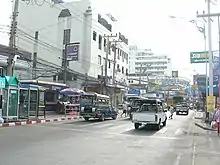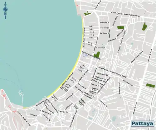 These are connected by the three major east-west aligned roads: North Pattaya Rd (Thanon Pattaya Nua), Central Pattaya Rd (Thanon Pattaya Klang) and South Pattaya Rd (Thanon Pattaya Tai). North Pattaya Rd is a dual carriageway and carries the highest volume of traffic to and from Sukhumvit Rd.