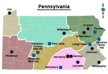 Pennsylvania is a state in the eastern United States. It is known for its Revolutionary War-era historical sites like Valley Forge, its large cities like Philadelphia and Pittsburgh, its farming regions, some occupied by the Amish, and a (once)-strong industrial history. With equally large swaths of cities and towns as fields and mountains, Pennsylvania is a rich and varied state, as well as a worthy travel destination.