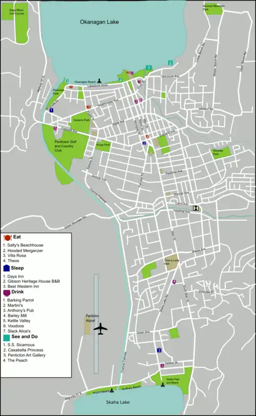 - 🌍 Penticton Yacht Club and Marina, 293 Marina Way, ☏ +1 250 770-2000, +1 250 770-2286 (gas dock). Services Okanagan Lake.