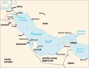 The Persian Gulf is located in the Middle East between Iran and the Arabian Peninsula. It is an extension of the Indian Ocean. The narrows at its mouth is the Straits of Hormuz, a strategically important area in various conflicts.