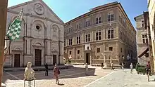 - Palazzo Comunale: Across from the church is the town hall, or Palazzo Comunale. When Corsigniano was given the status of an official city, a Palazzo was required that would be in keeping with the city's new urban position. It has a brick bell tower that is shorter than its counterpart at the cathedral, to symbolize the superior power of the church. The set-back addition to the tower dates from 1599. It is likely that Bernardo Rossellino designed the Palazzo Comunale to be a free-standing civic mediator between the religious space before the cathedral and secular market square to its rear.