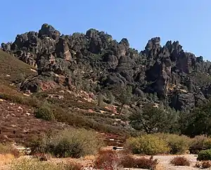 Pinnacles National Park is a United States National Park that protects a wilderness area containing the remains of half of a long-extinct volcano. It offers rugged, difficult hiking trails over high rock formations and through talus caves. Rock climbing is allowed in some places but is dangerous and requires some experience. Unlike most national parks, there are few options for people with mobility limitations.