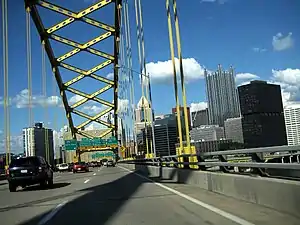 Downtown Pittsburgh is readily accessible by a number of freeways and bridges. From the east, I-376 (The Parkway East) connects downtown to the eastern side of Pittsburgh and I-76 (the Pennsylvania Turnpike), with three exits into Downtown: Second Avenue (right lane exit), Grant Street (left lane exit), and Stanwix Street (left lane exit). I-376 is also the best option for coming in from the airport and western suburbs, coming across the Fort Pitt Bridge (take the middle lane to exit into Downtown). I-279 (Parkway North/West) is your best option for coming in from the north - either exit on I-579 (the Veterans Bridge) or continue across the Fort Duquesne Bridge and exit there. From the southeast, Liberty Ave (which enters the Liberty Tunnel and then becomes the Liberty Bridge) is a good option.