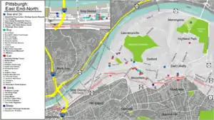 From downtown, simply take Liberty Avenue or Penn Avenue (they're parallel streets) east. You'll pass right through the Strip District. Stay on Liberty Avenue to get to Bloomfield. To get to Lawrenceville, get on Penn Avenue and continue east. Make a left on to Butler Street to get to Upper Lawrenceville, and continue on Butler to get to Highland Park and the Zoo. Staying on Penn Avenue will take you to Garfield and East Liberty.