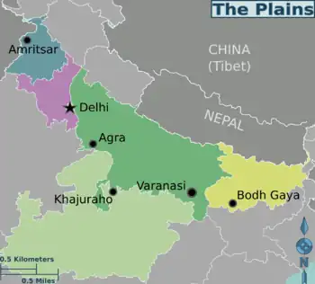 The Plains contain some of the most famous sights in the world. Agra is the home of the Taj Mahal; near Agra is the former royal town of Fatehpur Sikri, which is made out of red sandstone. The Ganges at Varanasi is both a sight and an experience — the crowds of people ritually bathing in the river, the funeral pyres near its banks, the splendid ghats. There are quite a few other places along the Ganges, Yamuna and other rivers sacred to Hindus that are worth visiting. The small town of Khajuraho boasts Tantric temple complexes that some art historians consider to represent the pinnacle of erotic art. The towns of Bodh Gaya and Sarnath are two of the wellsprings of Buddhism; Bodh Gaya in particular has impressive temples. Amritsar's pride and joy is the Golden Temple, the world headquarters of the Sikh religion. And of course there is the capital city of Delhi, which has numerous sights including the Jama Masjid and Qutb Minar, two of the best known examples of Islamic architecture in the country, and the Red Fort.